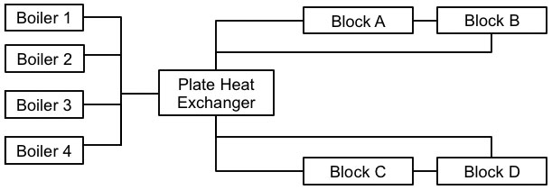 In the boiler house are 4 Buderus 100kw cascading boilers giving 400kw in total. They are connected to an insulated plate heat exchanger giving us 1 water circuit. The plate heat exchanger is connected to the 2nd water circuit that circulates around the flats. The plate heat exchanger protects the boilers from the water that is circulating around the flats.