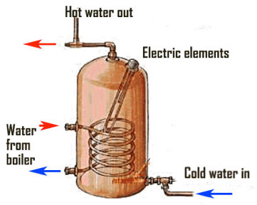 Some people also have a back up electric element called an immersion heater labelled "electric elements" in the diagram. Some people have been using both the common system and their immersion heater to heat their hot water with no controls to stop them when the water is hot.