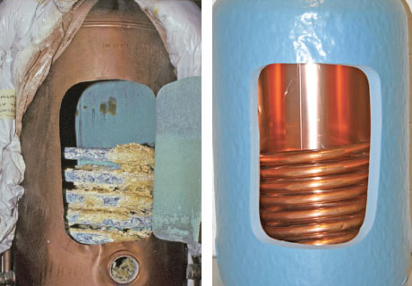 The cylinder on the left shows the heating coil covered in scale. The hot water from the common system has to pass through the coil and heat the limescale first before it heats the water that will come out of your tap. This is inefficient and leads to higher bills as more energy is needed to heat your water.